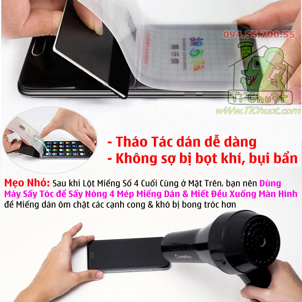 ☑️ Để các cạnh cong bám chắc & khó bị bong tróc thì các bạn nên dùng Máy Sấy Tóc để sấy nóng đều 4 cạnh, đồng thời miết nhiều lần các cạnh ép xuống màn hình trong khoảng 30s .